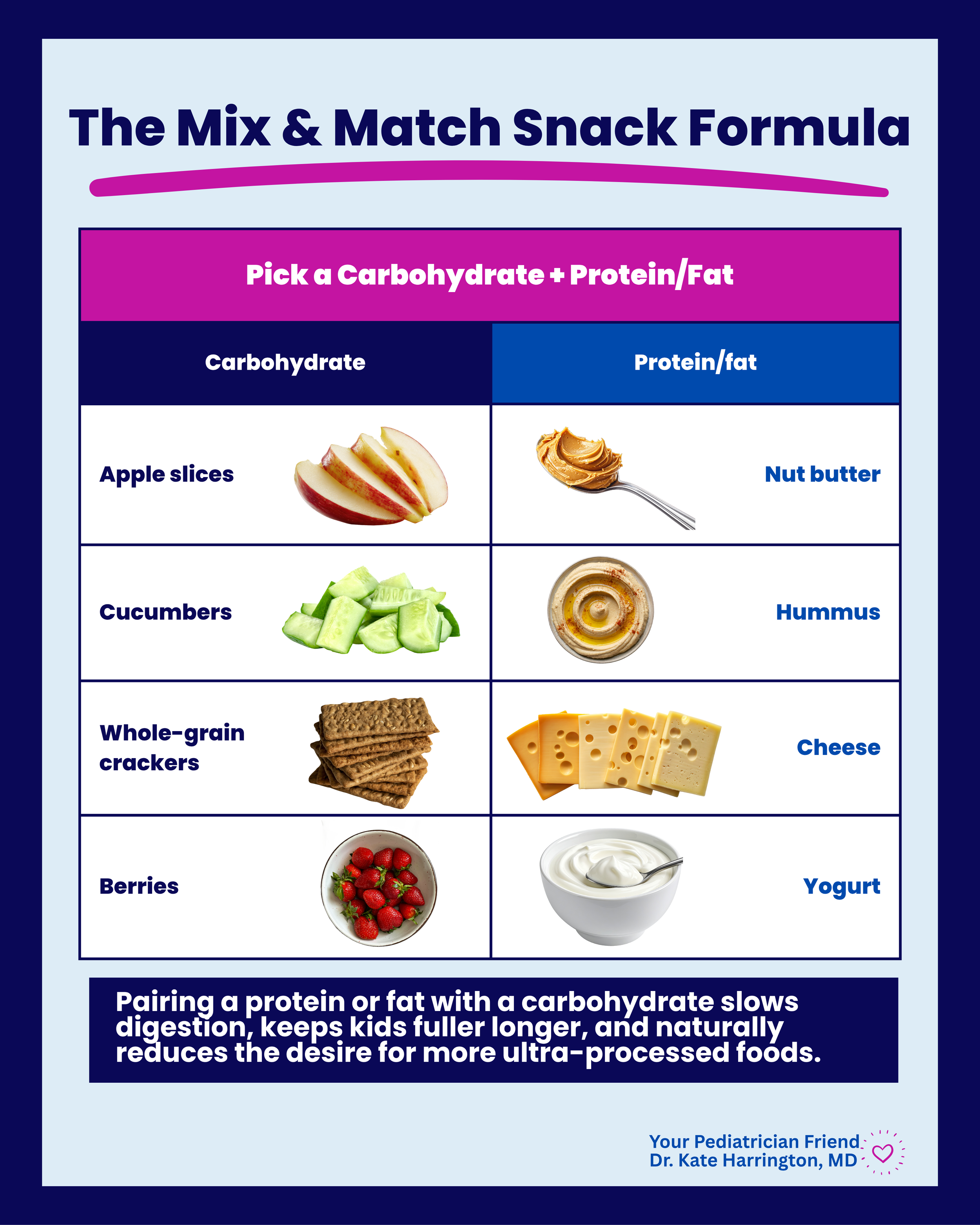 Why? Well, most ultra-processed snack foods are high in refined carbohydrates and low in protein and fiber, which means they digest quickly, don't provide lasting fullness, and lead to more grazing throughout the day. Pairing a protein or fat with a carbohydrate slows digestion, keeps kids fuller longer, and naturally reduces the desire for more ultra-processed foods.