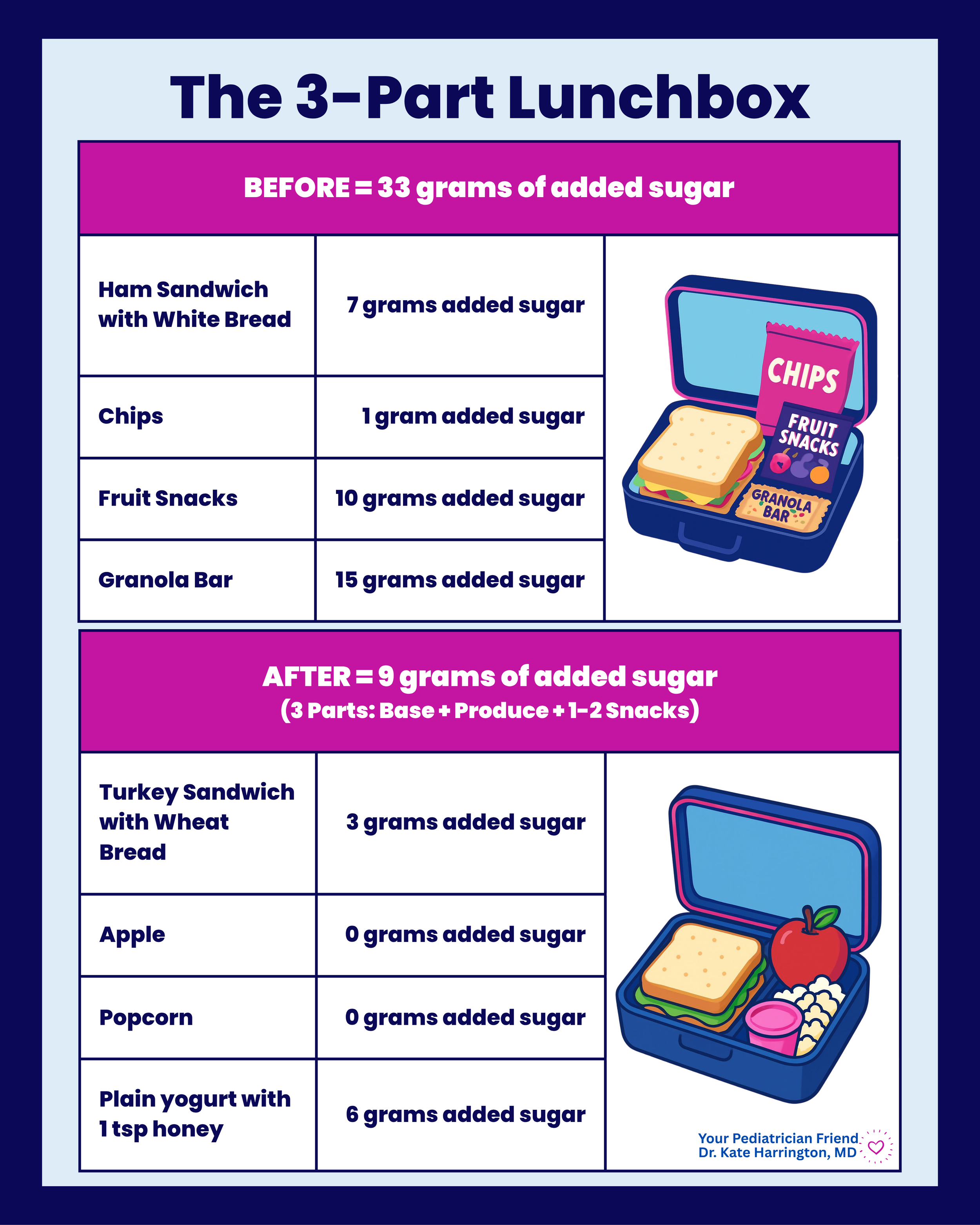 You don’t have to eliminate the sandwich (or the base), but just try and change the other things. The after version is meaningfully better, and just involves a few simple changes that don't require your child to eat anything too unfamiliar. Reducing even one or two ultra-processed items from the lunchbox can significantly improve overall diet quality. The goal is better, not perfect!