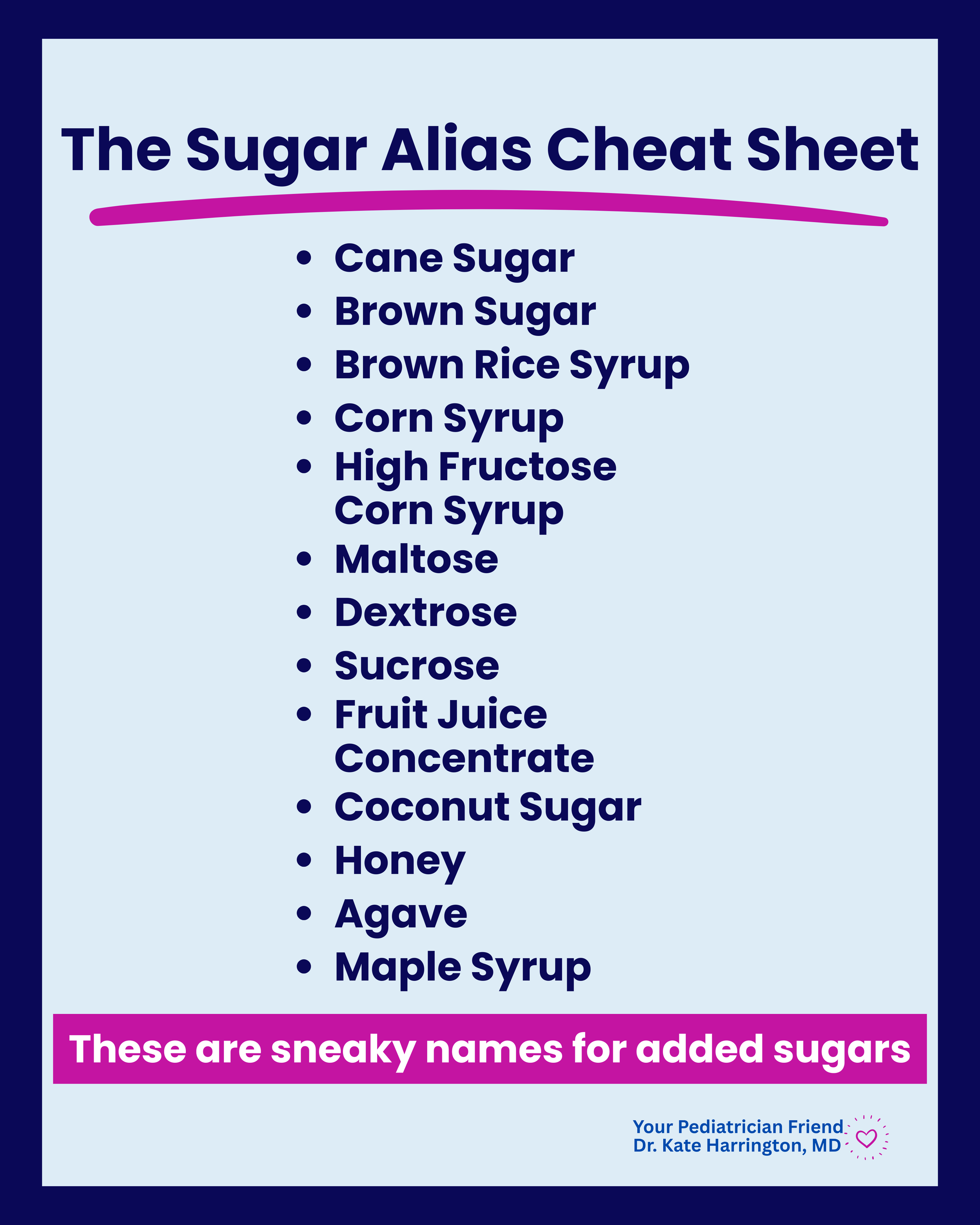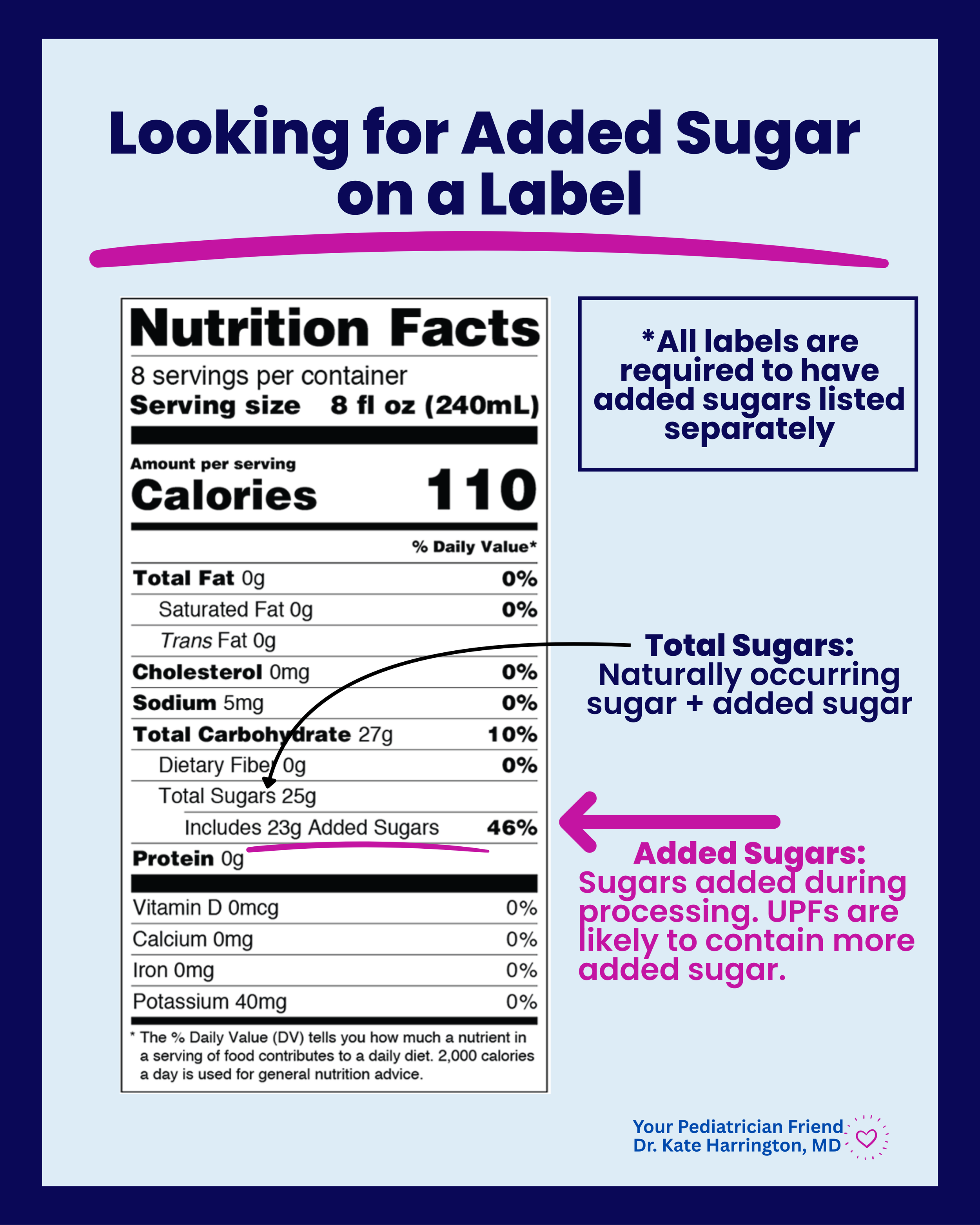🩺 Pediatrician’s Insight: "Added Sugars" became its own required line on the Nutrition Facts label in 2020, and that is the line to watch. If a single serving of something has more than 6–8g of added sugar, that's a meaningful chunk of a child's daily limit. But remember, context matters: one food with 8g isn't a crisis, but eight foods with 8g is a problem. (And naturally occurring sugars in fruit and dairy are different, and don’t need to be counted.)