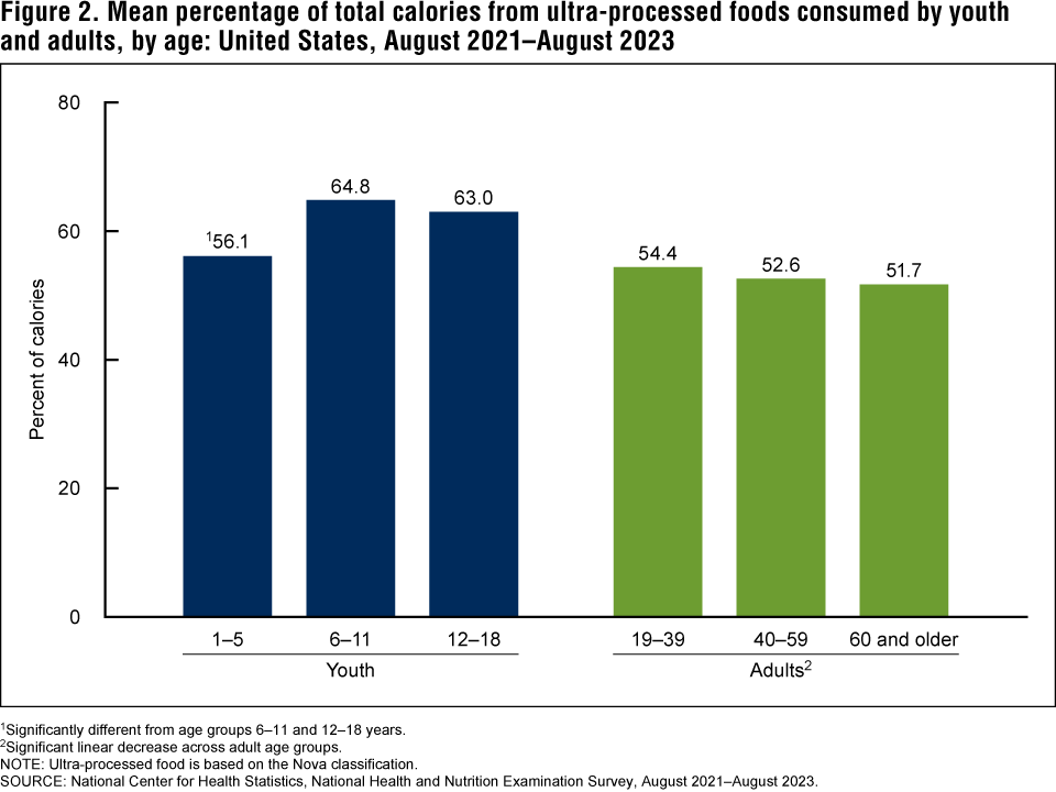 Williams AM, Couch CA, Emmerich SE, Ogburn DF. Ultra-processed food consumption among youth and adults: United States, August 2021–August 2023. NCHS Data Brief. 2025 Aug;(536)1–11. DOI: https://dx.doi.org/10.15620/cdc/174612
