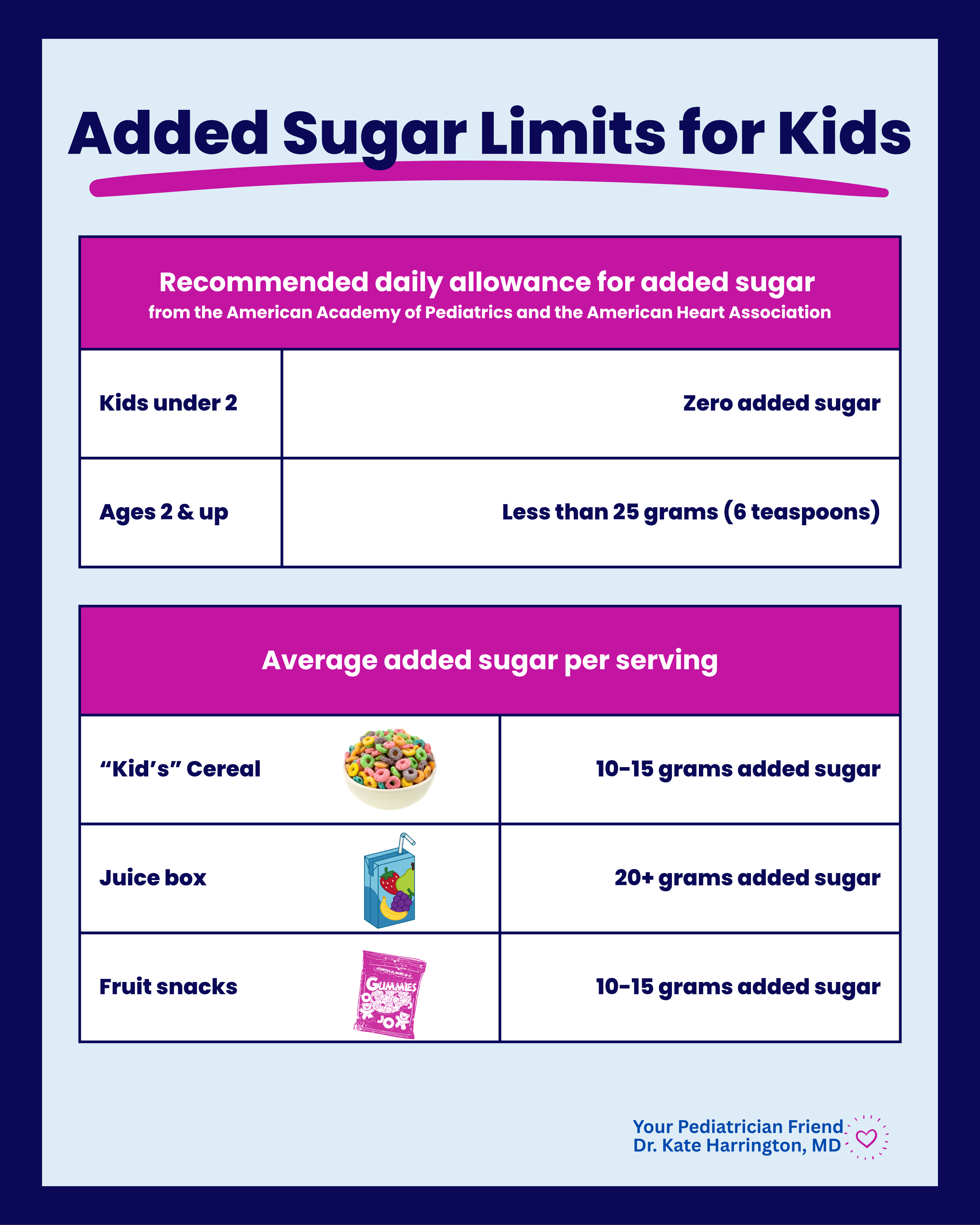 The American Academy of Pediatrics and American Heart Association give us a concrete target: zero added sugars for children under 2, and less than 25 grams (6 teaspoons) per day for ages 2 and up.