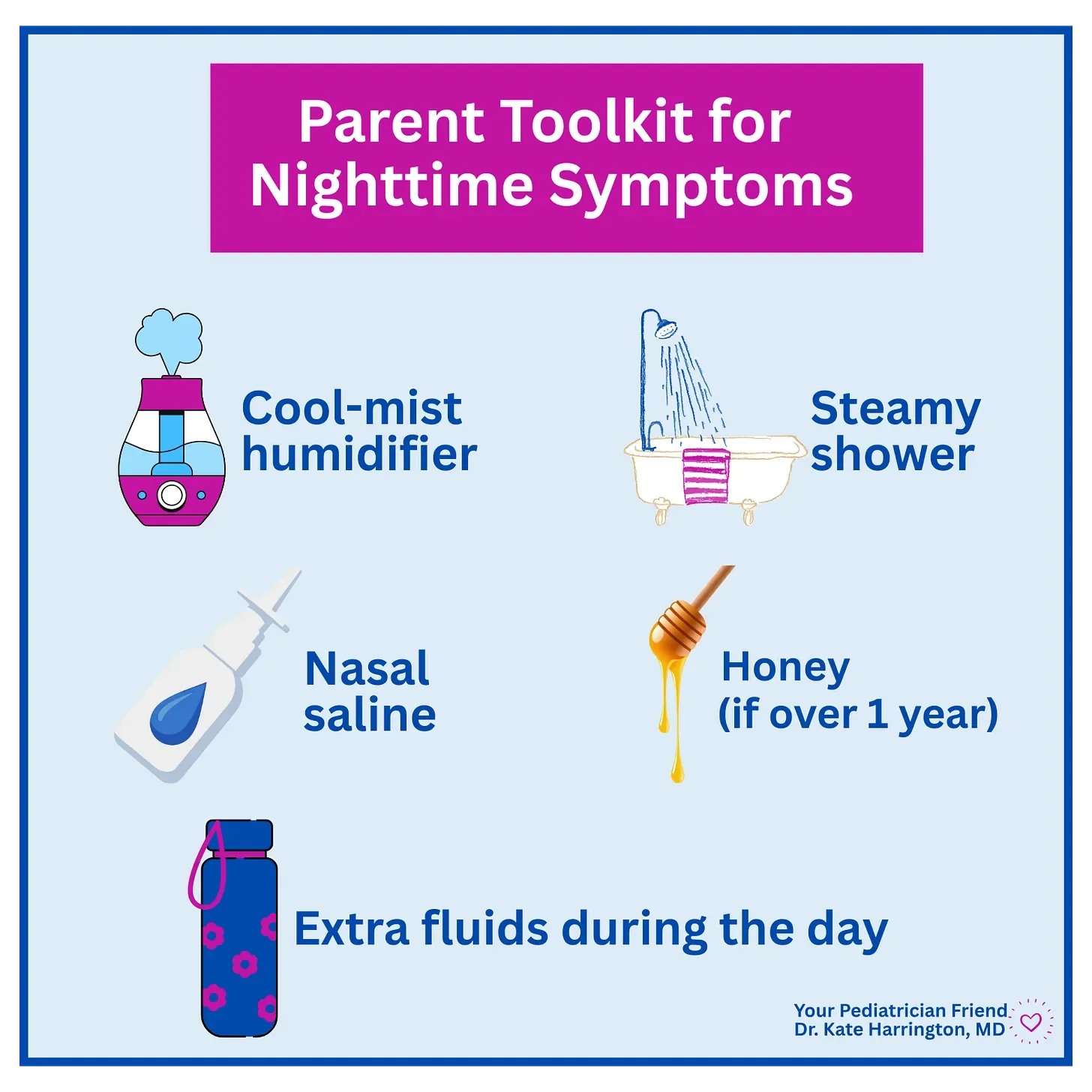 🩺 Pediatrician's Insight: A cool-mist humidifier, nasal saline spray, and some steamy air from a shower or bath before bed can all help soothe dry airways and move mucus along. But how can you get your child to try nasal saline? Try to have your child give their favorite stuffed animal nasal spray first, then let the stuffie spray your child. Make it as fun as possible!