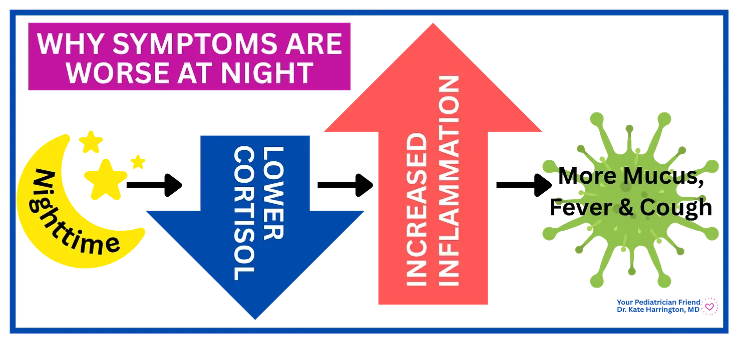 Kids’ symptoms often seem worse at night because of gravity, circadian rhythms causing natural drops of cortisol and rises in temperature, dry air, and good old-fashioned fatigue. Understanding these patterns helps you respond with more confidence, less panic, and less fear.