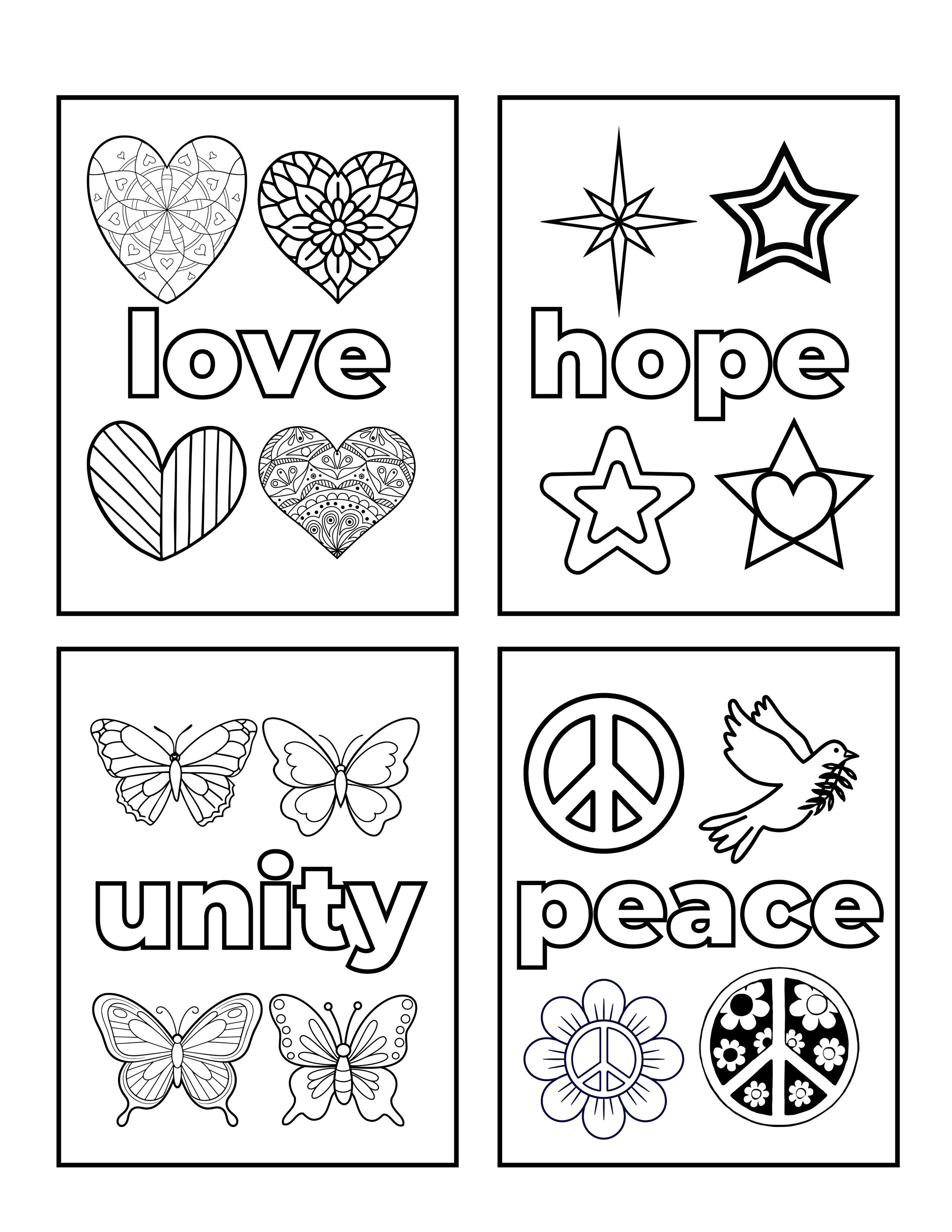 Download 4 different coloring pages to celebrate love, hope, unity and peace. Images are large enough to be cut out and displayed on your windows!Just click the image to download the PDF. Happy coloring!